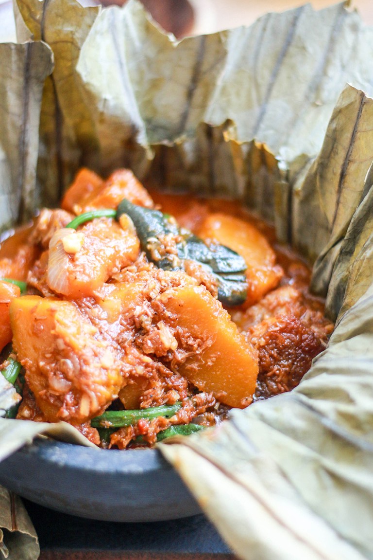 As me and my friend slowly realized that we were seated and ready to devour on our cholesterol-party kind of lunch, we just had to counteract them all with some veggies. Which was why we opted for A Pot of Pinakbet, a take on the classic dish but made more interesting by stewing it in a lotus leaf topped with bagnet (crispy pork belly) and squash flowers. Who ever said eating vegetables is boring?