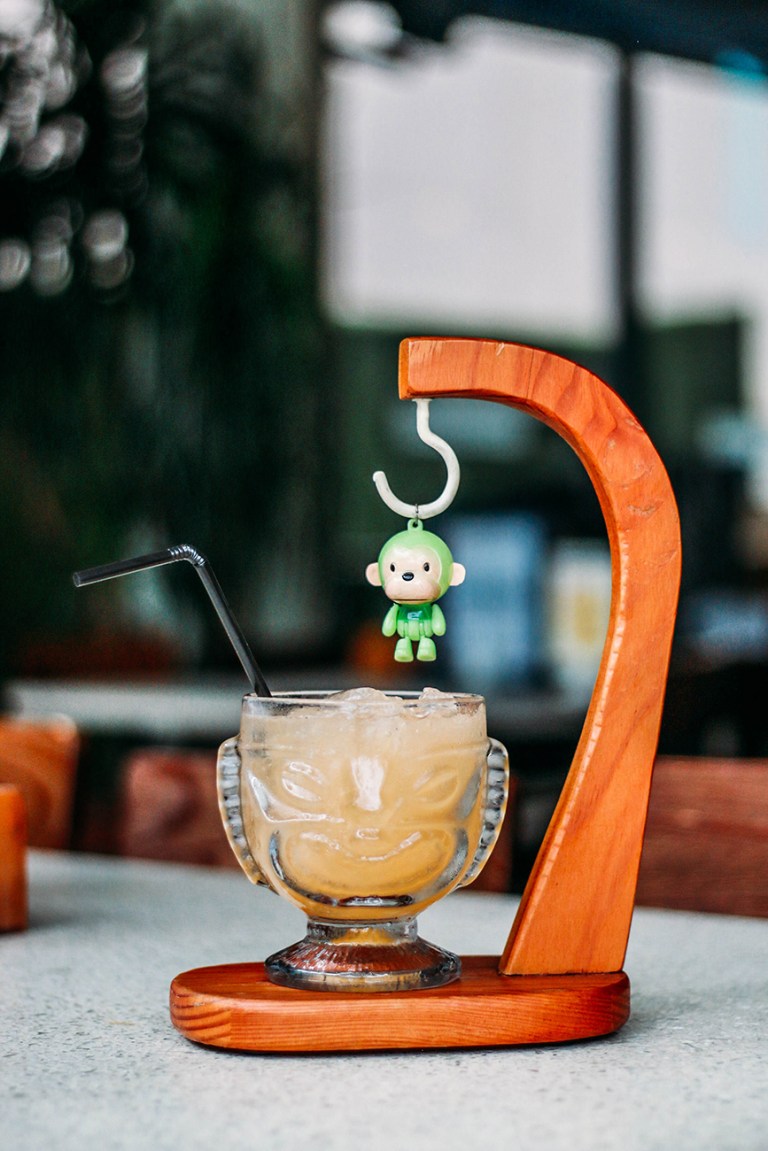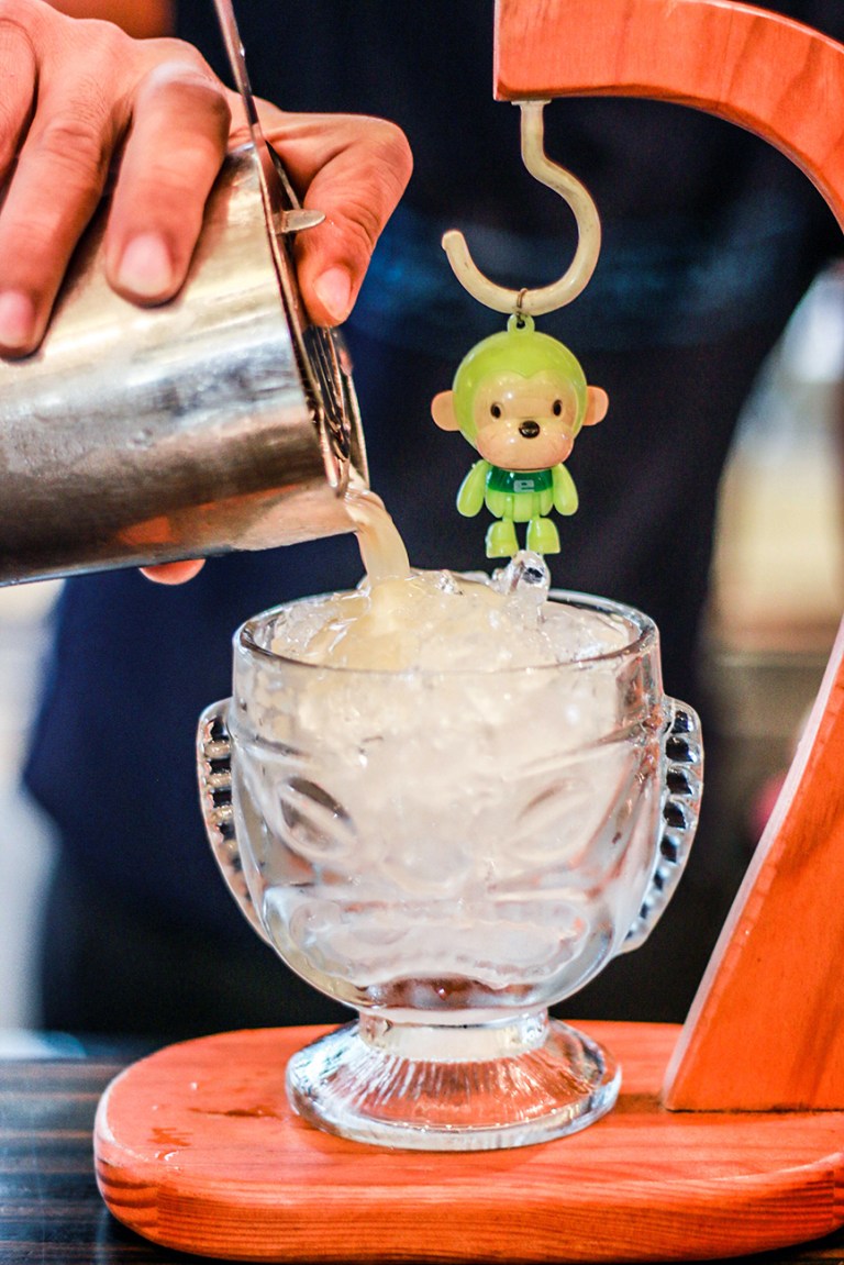 This drink may look cute and fit for a baby’s crib, but beneath the innocent presentation is a potent concoction of rum, guava daiquiri, sour mix, and bitters. As with any tiki cocktail, the Sea Monkey makes us wish we were sipping it by the beach and enjoying its tropical flavors under the warm sun and cool breeze—and just like that toy monkey on the brink of diving into a pool of booze, we wish we were close to the refreshing sea too.