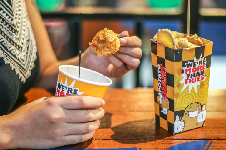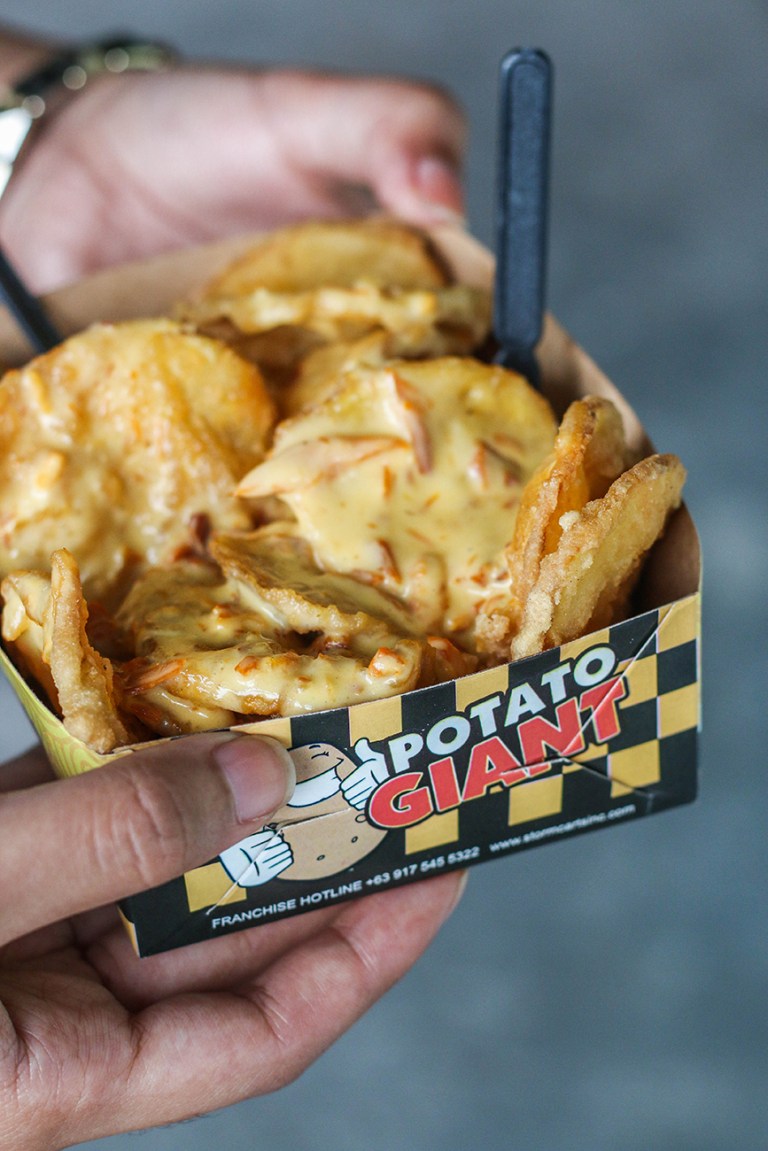 We started off light. We figured we’d like to get to the snacks first then move our way to the meals so we will get full slowly but surely. When we saw Potato Giant, we instantly knew we’ll start our gastronomic journey with them. We got 3 items from them— Cheesy Bacon Pot Pots, Potato Balls with Bacon and Mozzarella, and Mojo Potato in Sour Cream. Pot Pots are simply thinly-sliced potatoes fried to a crisp. We like that the batter was light and airy that it didn’t weigh down the potatoes but it kept them crispy enough even when smothered with cheese and bacon bits. The potato balls were flavorful though we would’ve wanted more mozzarella to get that creamy and slightly chewy texture. The mojo potatoes, on the other hand, were crispy and generously covered with sour cream powder. Amongst the 3 items we got, The Cheese Bacon Pot Pots is the one we will order again.