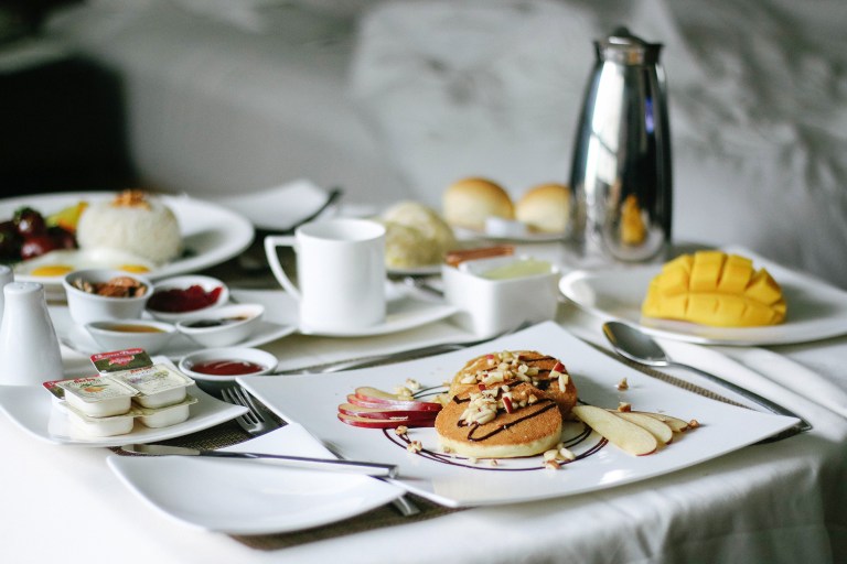 Buffet breakfast in Flavors Restaurant comes with every stay but since we were on our lazy staycation mood, we opted for their In-Room Breakfast. They provided the room with a breakfast menu specific to in-room dining so we ordered from that list. We got us some Buttermilk Pancakes with Apples and Walnuts, Bacon and Eggs, Longganisa with Garlic Rice and Eggs, Ensaymada, fresh ripe mangoes, rolls, and coffee. The pancakes were a bit crispy on the outside which we prefer, the bacon strips were crispy too, the sunny side up eggs were perfectly cooked, and the longganisa was delicious. From the time our orders were taken, our food arrived in 20 minutes which was impressive. We liked the fact that they kept the dishes in the warmer so they were fresh and hot when they got to us.