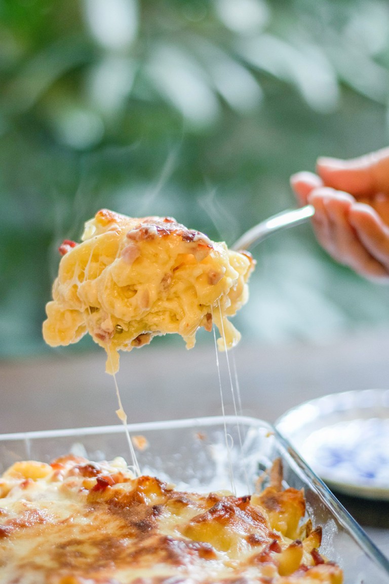 - Throw in the macaroni and mix. Transfer to a baking container or Pyrex.