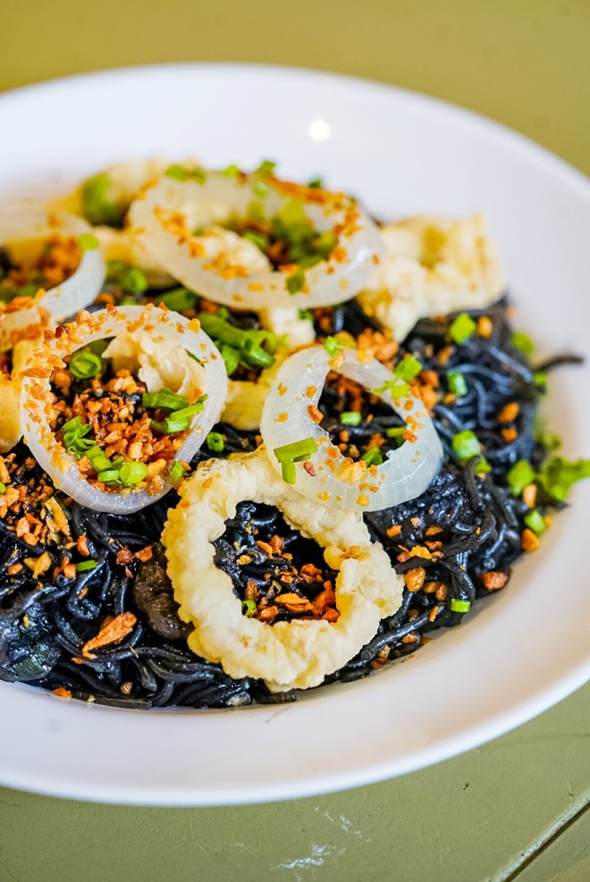 Pancit pusit was originally pancit choca ensu tinta, Chavacano for pancit in squid and ink, and is one of the most unique pancit dishes. The love-child of Caviteno, Basque-Mexican, and Chinese influences, made possible by the Manila-Acapulco Galleon Trade, it was developed in Cavite during the Spanish occupation. It is a pancit guisado dish made with sotanghon and squid or cuttlefish ink adobo. It is garnished with kinchay, green onions, toasted garlic, and labuyo.