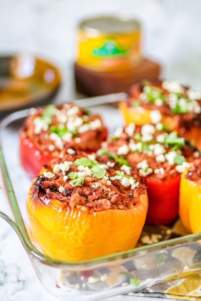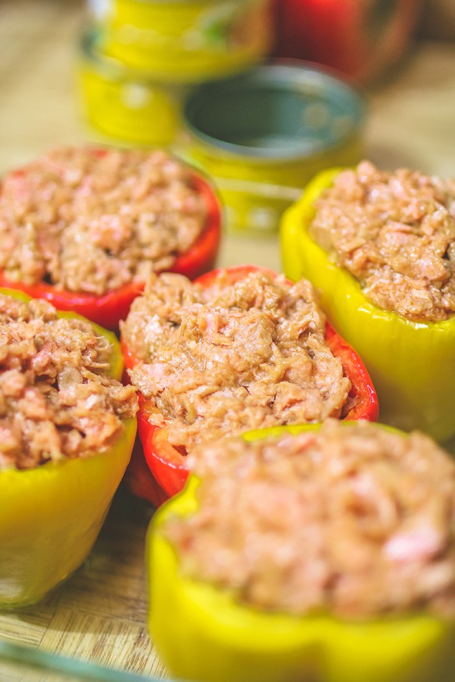 - Once done, open the 2nd can of San Marino Chili Corned Tuna, and put some on top of each bell peppers.